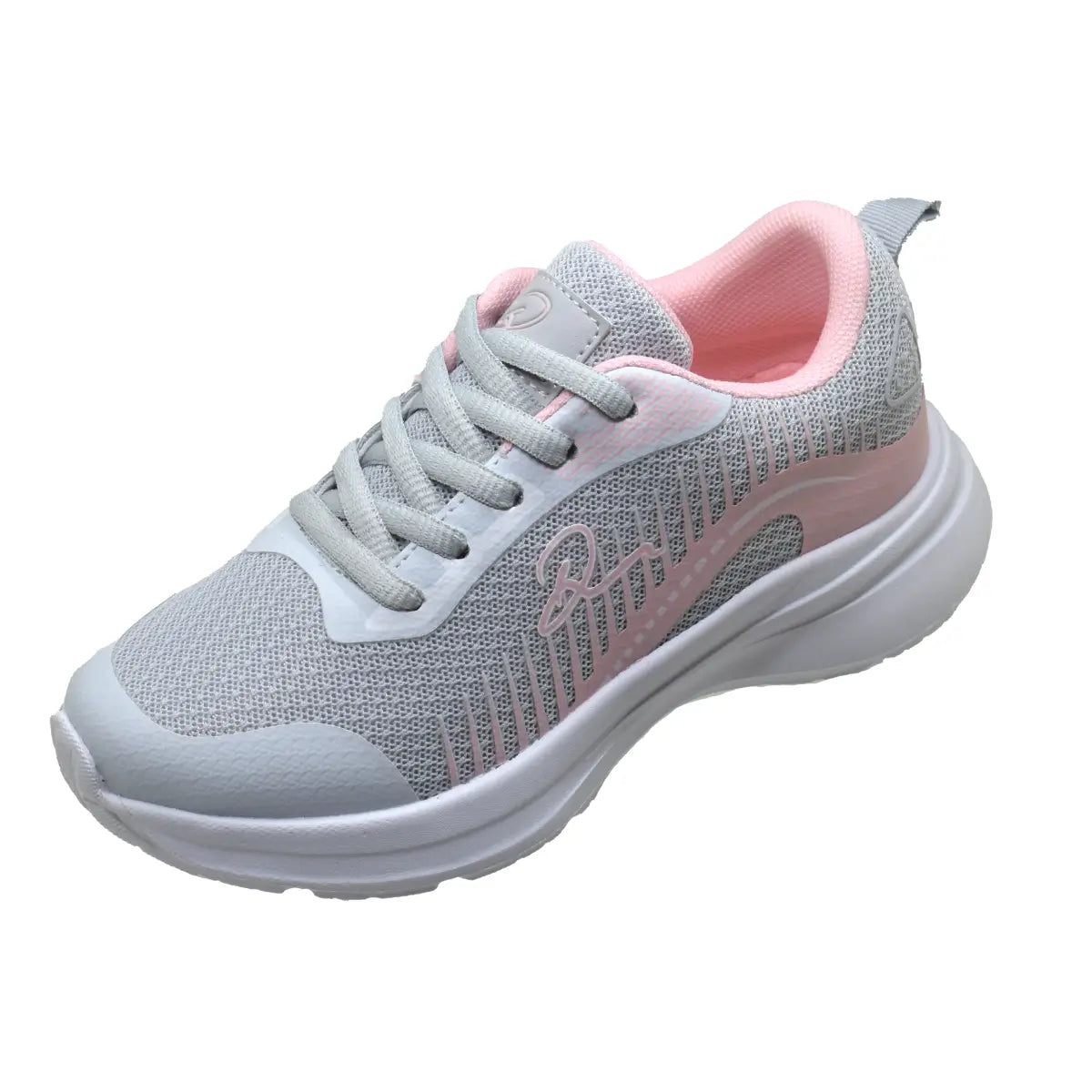 This is a Girl's size gray sneaker with pink accents and a mesh design. The lightweight sole and padded collar offer support. The pink inner lining adds a pop of color.