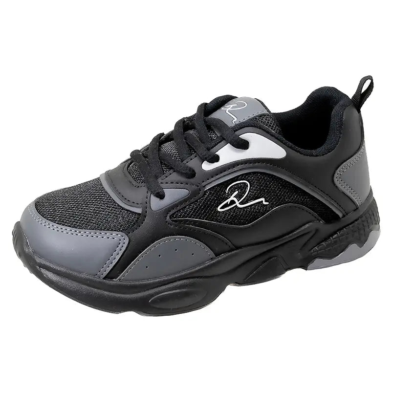 This is a Kid's size black and gray athletic shoe with a modern design. The lace-up closure and mesh fabric provide breathability. The gray details create a stylish contrast.