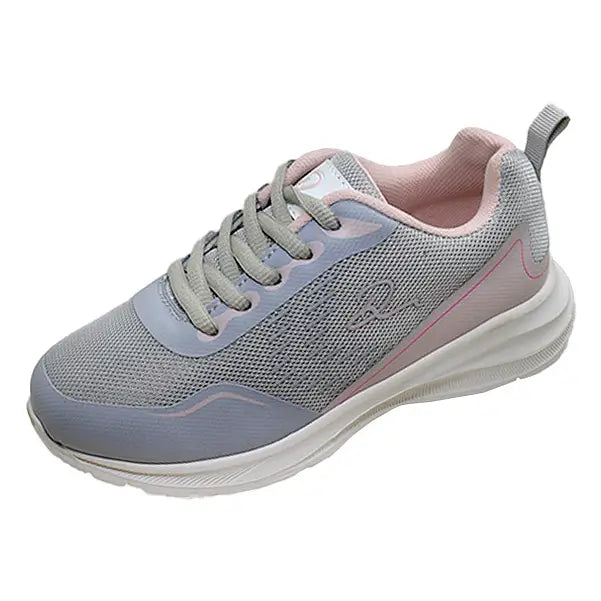 This is a Kid's size gray sneaker with pink accents. The mesh design ensures breathability, and the cushioned sole provides comfort. The pink details add a soft touch.