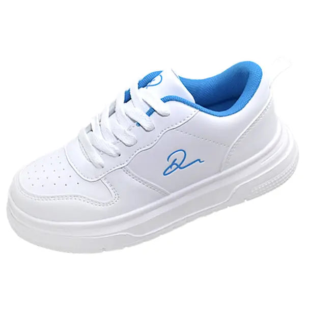 This is a Kid's size white and blue sneaker with a classic low-top design. The cushioned sole and padded collar provide comfort. Suitable for casual and light sportswear