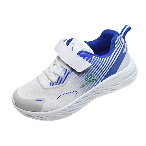 This is a Kid's size white sneaker with blue accents and velcro closure. The breathable fabric and padded sole ensure comfort. The blue details give it a sporty touch