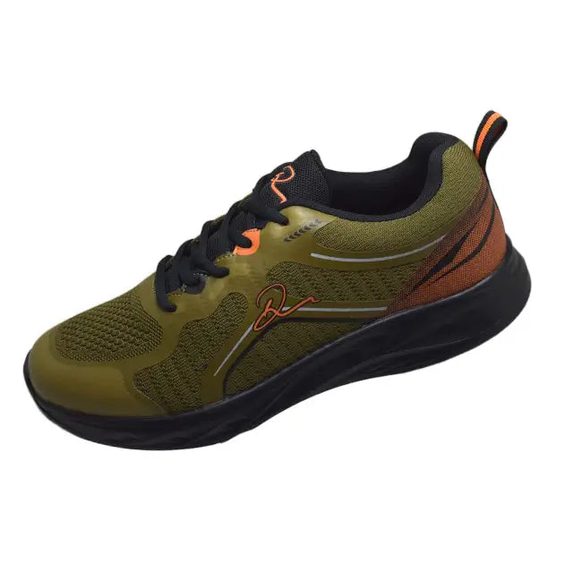 This sneaker features an athletic design with a striking Olive green mesh upper and black sole, accented with burnt orange details.The breathable material and cushioned sole make it an excellent choice for casual wear or light workouts. A sleek, sporty aesthetic is enhanced by the subtle yet stylish logo on the side.
