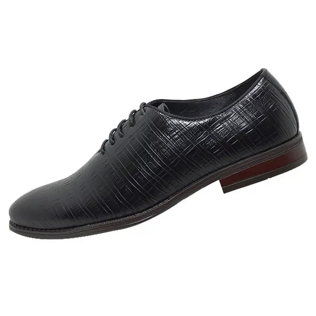 This is a polished black dress shoe with a lace-up design and textured finish. Its sleek and professional look makes it suitable for formal wear.