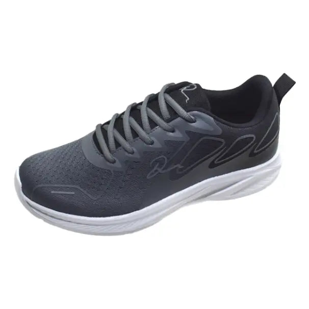 This sneaker showcases a modern athletic sneaker in black and gray tones with a sleek design. It features a breathable mesh upper, synthetic overlays for support, and a cushioned white sole for comfort. The shoe also has a stylish wave-like pattern on the side, enhancing its sporty aesthetic.