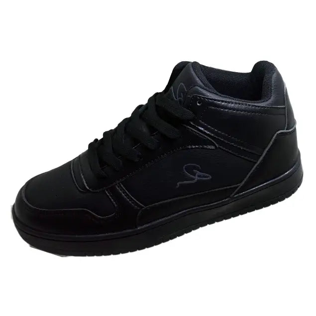 This is a Women's black high-top sneaker with a glossy finish. The lace-up closure provides a snug fit, and the padded collar offers extra support. Great for streetwear or casual outings.