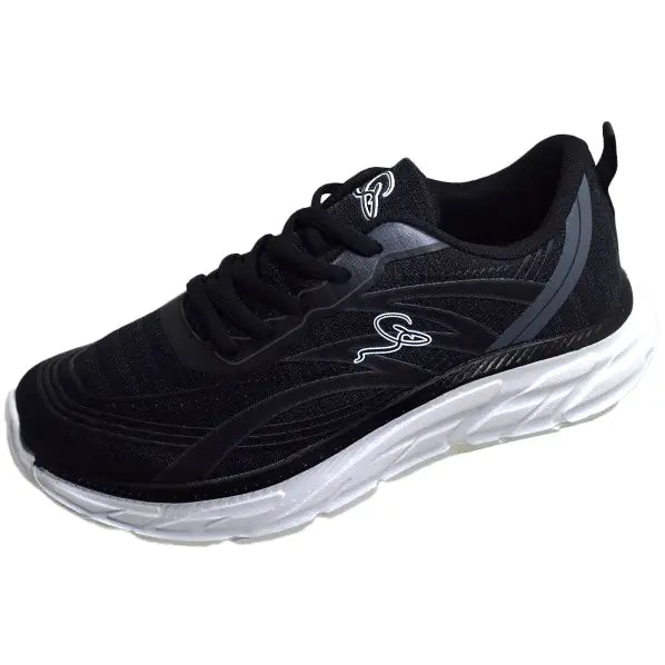 This is a Women's black and white athletic shoe with a breathable upper and a cushioned sole. The lace-up design ensures a secure fit. Suitable for training and casual wear.