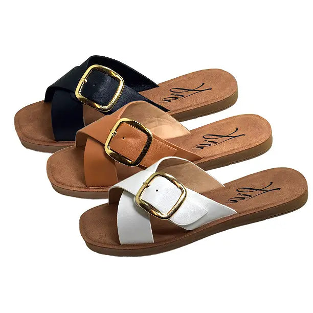 This is a set of Women's slip-on sandals with metallic and leather straps. The gold buckles, black, white, and brown tones give them a stylish and versatile look. The cushioned sole ensures comfort.